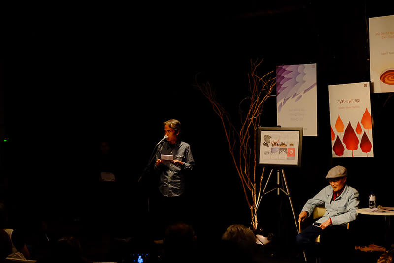 The event also featured poetry reading from some of familiar names like Tina Talisa, an ex TV anchor, Iwan Setiawan, an author of famous novel called “9 Summers 10 Autumns”, fellow poets and literateurs, Goenawan Mohamad and Joko Pinurbo. There were also some talented names like Ni Made Purnama Sari and Cyntha Hariadi who read Sapardi’s poems or verses. Poetry musicalization was also displayed with Tatyana Soebianto and Umar Muslim as the performers. Sapardi said that the modification of his creation helped the readers or listeners to acknowledge his works. Instead of being disappointed with the interpretation, the man who’s often seen wearing a hat said that he was happy to be recognized by other artists from different fields. The event commemorated his roles and significance for Indonesia’s literary world.