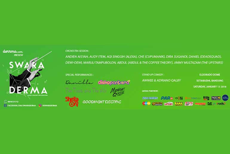 Derrma.com, an online marketplace application and website will hold a special concert in 2018 called Swara Derma. The event which will take place at Eldorado Dome, Bandung presents an art performance which combines a charity in it. On 13 January 2018, the event is set to be a grand rendition from some of the best musicians in Indonesia. There will be an orchestra session conducted by Job Rusli and Friends. The orchestra session features prolific singers like Andien, Aqi (ALEXA), Abdul (Abdul & Coffee Theory), Dira Sugandi, Che (Cupumanik), Daniel (Deadsquad), Dewi-Dewi, Jimi Multhazam (The Upstairs), Maruli Tampubolon and Audy Item. Not only musical performances, there will also be stand up comedy from Adriano Qalbi and Awwee. If you have laughed out loud and enjoyed the orchestra performances, your eyes and ears are about to be delighted once more with performances from a series of talented soloists, rising bands, and legendary acts. Sheila on 7, Danilla, Goodnight Electric, Midnights Quickie, The Trees and The Wild, and Diskopantera will entertain you throughout the night.