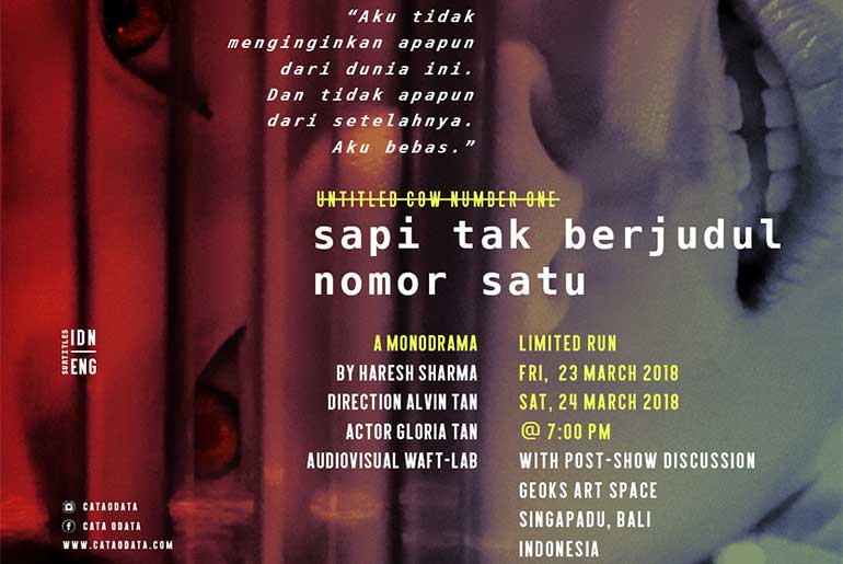 BALI – Cata Odata, sebuah rumah seni dari berbagai disiplin bekerja sama dengan WAFT-Lab (Surabaya) dan The Necessary Stage (Singapura) akan mengadakan sebuah pertunjukan monodrama bertajuk “untitled cow number one” (UCNO). Ditransalasikan sebagai ‘sapi tak berjudul nomor satu’, pertunjukan yang melibatkan talenta antar negara ini akan dilaksanakan selama dua hari dari tanggal 23 – 24 Maret 2018 di GEOKS ARt Space, Singapadu, Bali. Acara ini terselenggara di bawah program CO.Lab yang diinisiasi oleh Cata Odata yang bertujuan menjadi ajang kolaborasi antar berbagai pelaku seni dan kreatif dari berbagai latar belakang budaya, daerah, sosial dan lain-lain. ,”Cata Odata Laboratory atau disebut CO.Lab, terbuka bagi mereka yang memiliki semangat untuk berkolaborasi serta berbagi pengalaman dan pengetahuan. Program ini diadakan setidaknya setahun sekali diikuti dengan workshop kreatif dan sesi percakapan bersama, kali ini dengan para tim UCNO,” jelas Ratna Odata, salah satu founder dari Cata Odata.