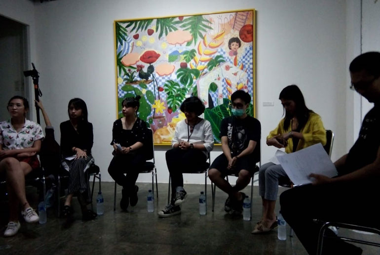 Igi Anjangbiani’s works tend to look fun with his usage of humoristic approach and pop culture references. The artist whose activities can be traced on his Instagram with username @sombong_, said that he wanted to create works that are honest, unfabricated and in correspondence with the ability and technology that he could achieve, filtered through his experiences, thoughts, and feelings. Besides painting, his works can also be found on urban toys that are also on display at the exhibition. Artist Nadira Julia takes a feminist approach in delivering her works. While oftentimes female figures are portrayed with gentleness, she could not withstand a certain stereotype that is put on works involving woman figures. Her portrayal of females signifies her stance on how she wants women to be seen. You could see a lot of symbols and surrealist surroundings that are present in her paintings.