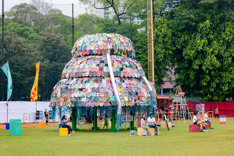 Just like we said earlier, Joyland’s commitment to hold eco-friendly show is no joke. They collaborate with art studio called This/Play to create various installations like the huge Throwie Monsta that was made out of 6,900 plastic waste. It doesn’t stop on art installations, Olah Plastic as another collaborator on this project managed to make various signage, power outlets, stools, children playground and many more out of 438.84 of plastic waste that they have repurposed! We hope their creations did not go to waste after the festival was held.